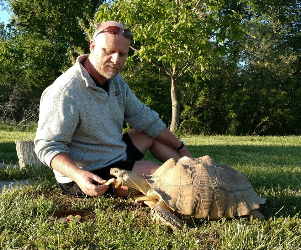 ^Dad’s sulcata tortoise has a Tile glued to its shell, so he can be found via bluetooth when he wanders off. One day Darwin dislodged the Tile, and then went on a grand adventure. I found out when Dad made a Facebook post asking all his students and friends to keep an eye out for a seventy pound tortoise roaming the countryside. “His tracker isn't working. I've been searching for hours,” he wrote. “He is very friendly, and loves strawberries.” If it had gone on any longer, I think he’d have printed up dozens of “Have you seen this tortoise???” fliers and scattered them about the little towns near his farm. But Darwin came back, all on his own! And Dad fed him fruit to welcome him home.